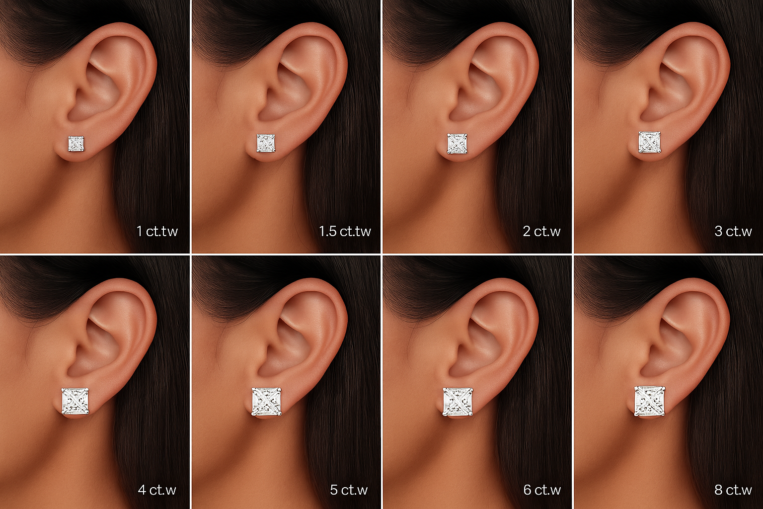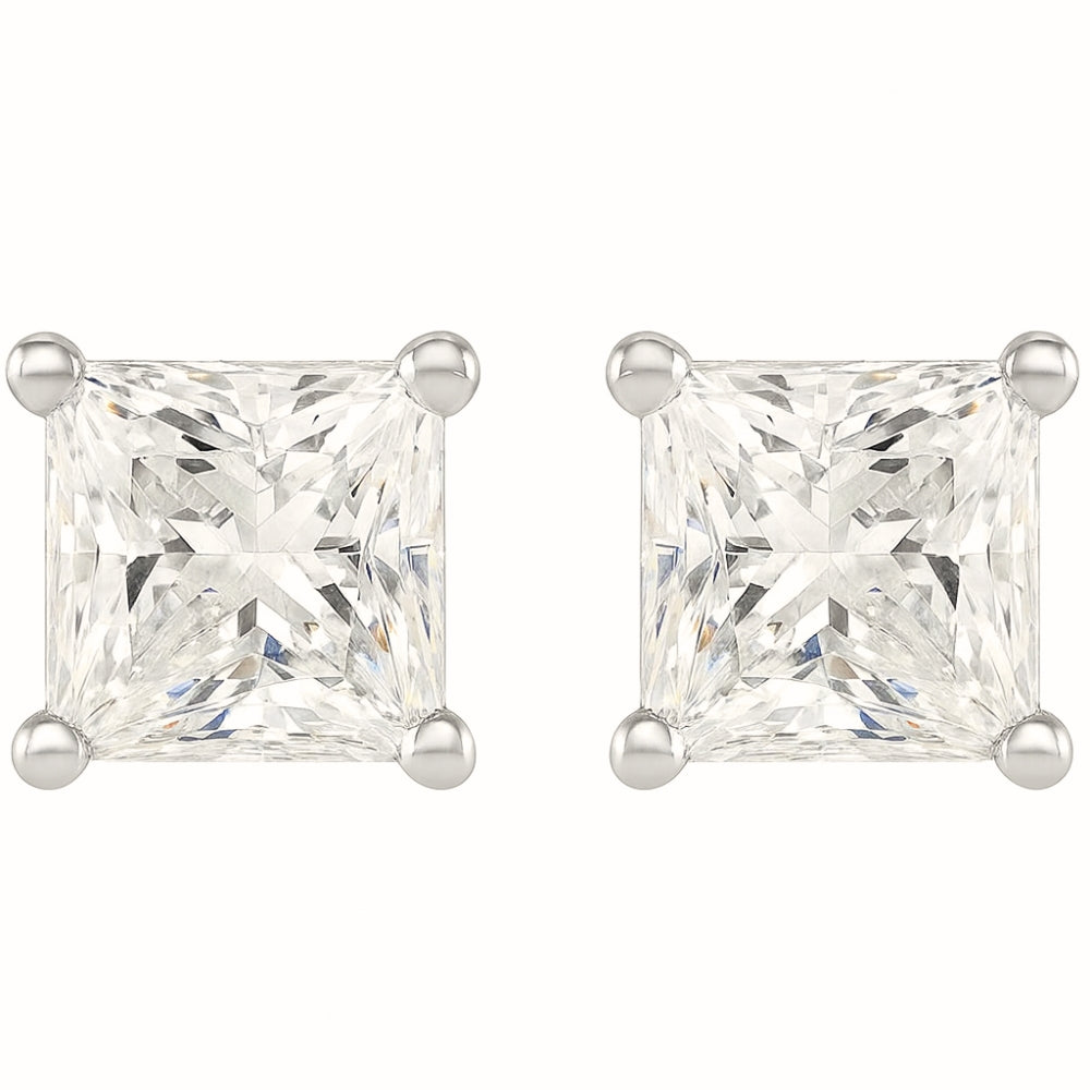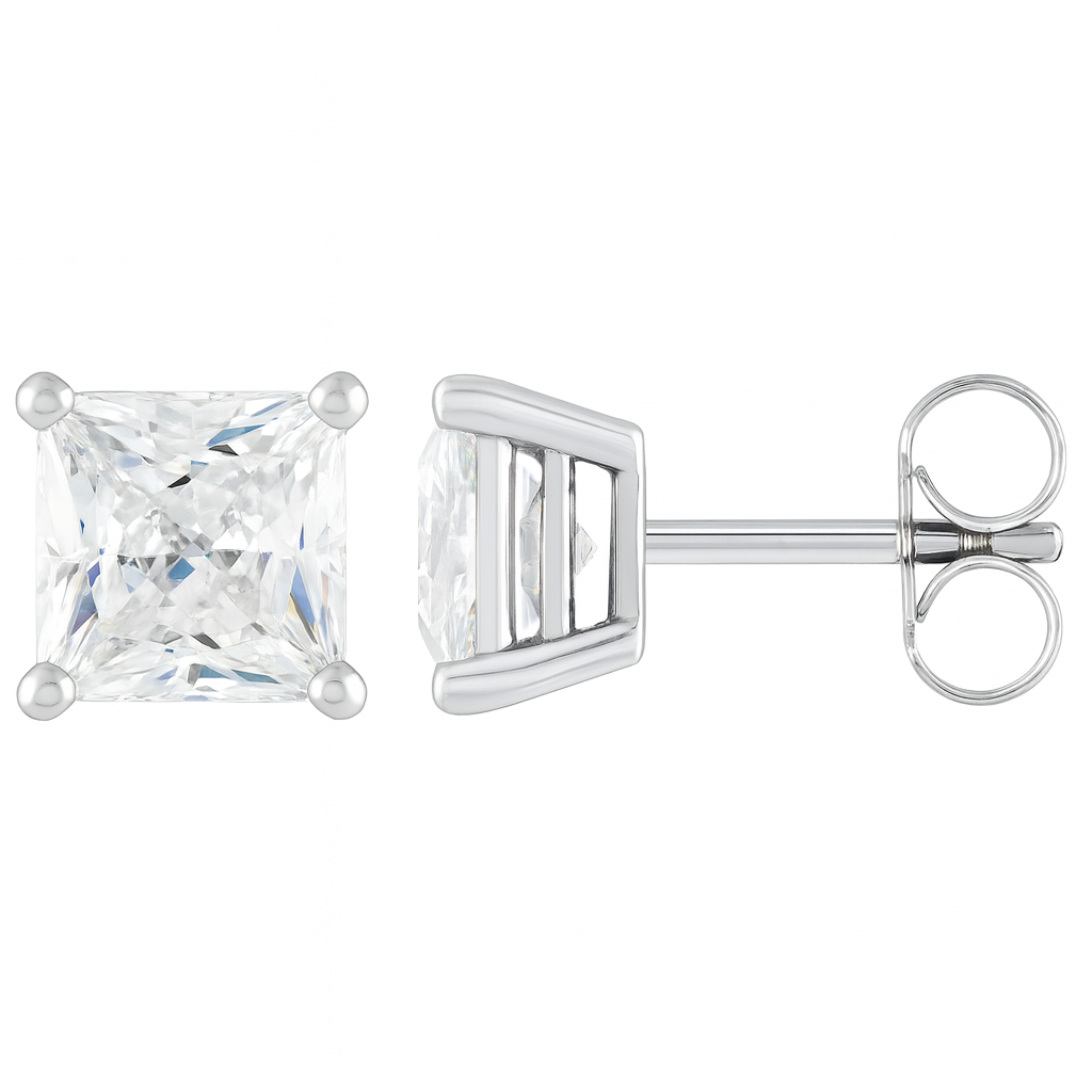 Shop JB Jewelers Princess 4-Prong Lab Grown Diamond Solitaire Studs available in multiple sizes. Each pair of diamond studs that are 2 carat total weight & higher, are accompanied with an IGI diamond grading report.